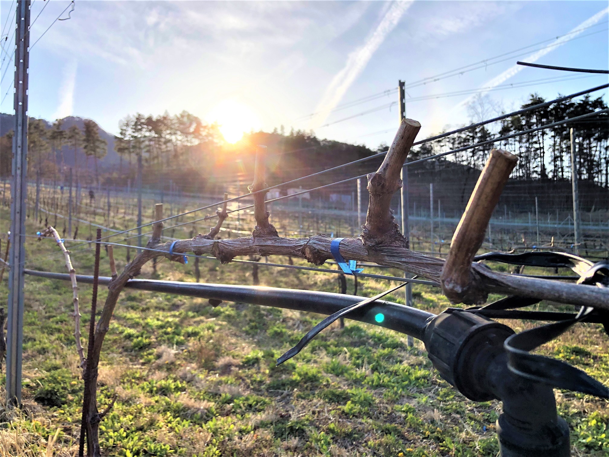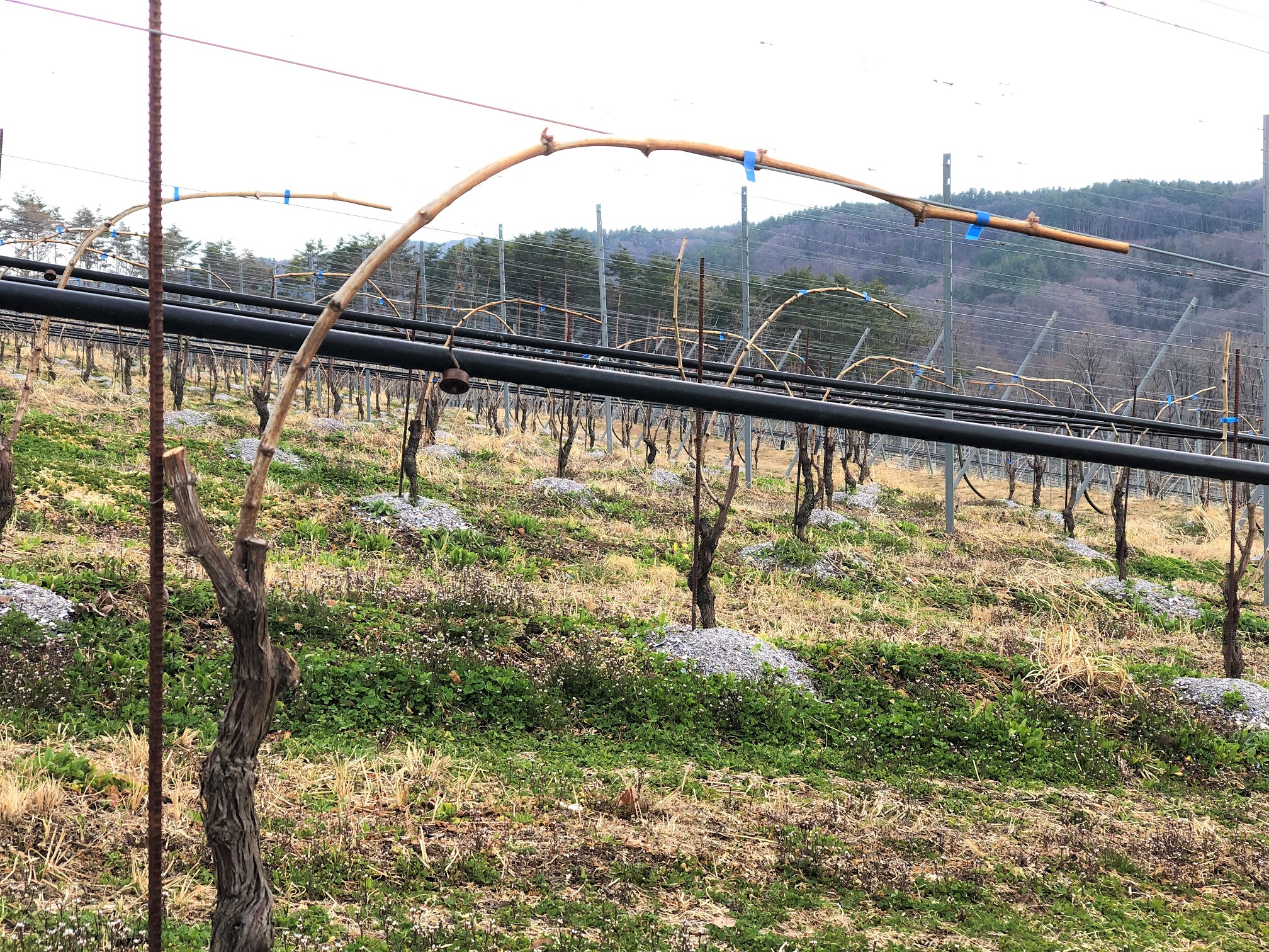 四月に入りましたが、ようやく白州圃場での冬季剪定と結果母枝の誘引作業が終りを迎えます。