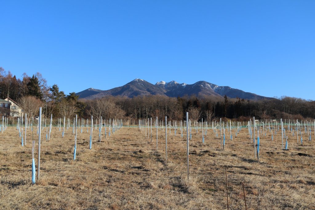 八ヶ岳を背景に、標高950mで甲州ぶどうの圃場づくりを行っています。