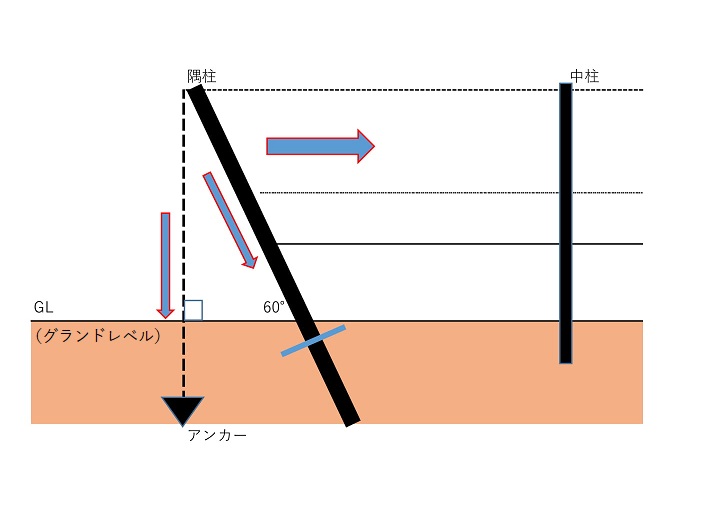 隅柱(両端の柱)は線の張力に対抗するために約60度の角度で打ち込みます。