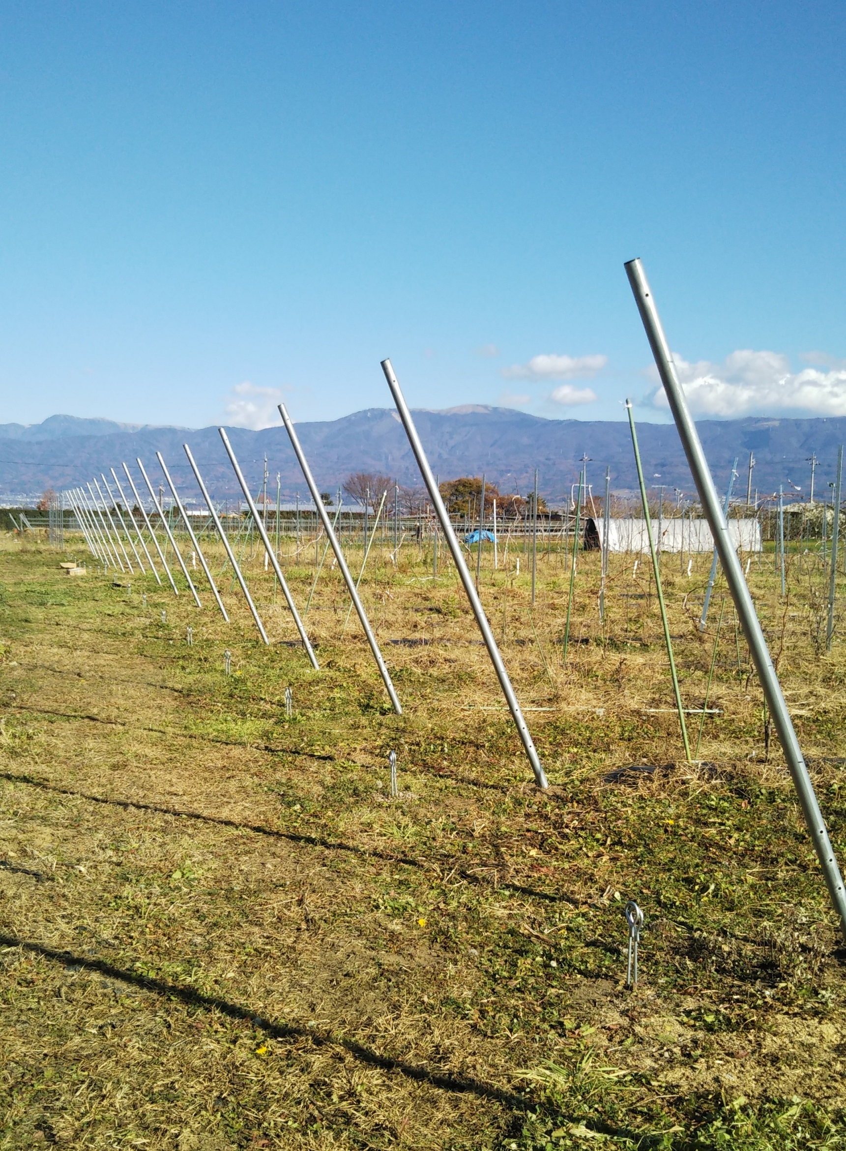 年月が経つと、どんどん畑の内側に傾いて、いくら線を張り直しても誘引線が緩んできます。