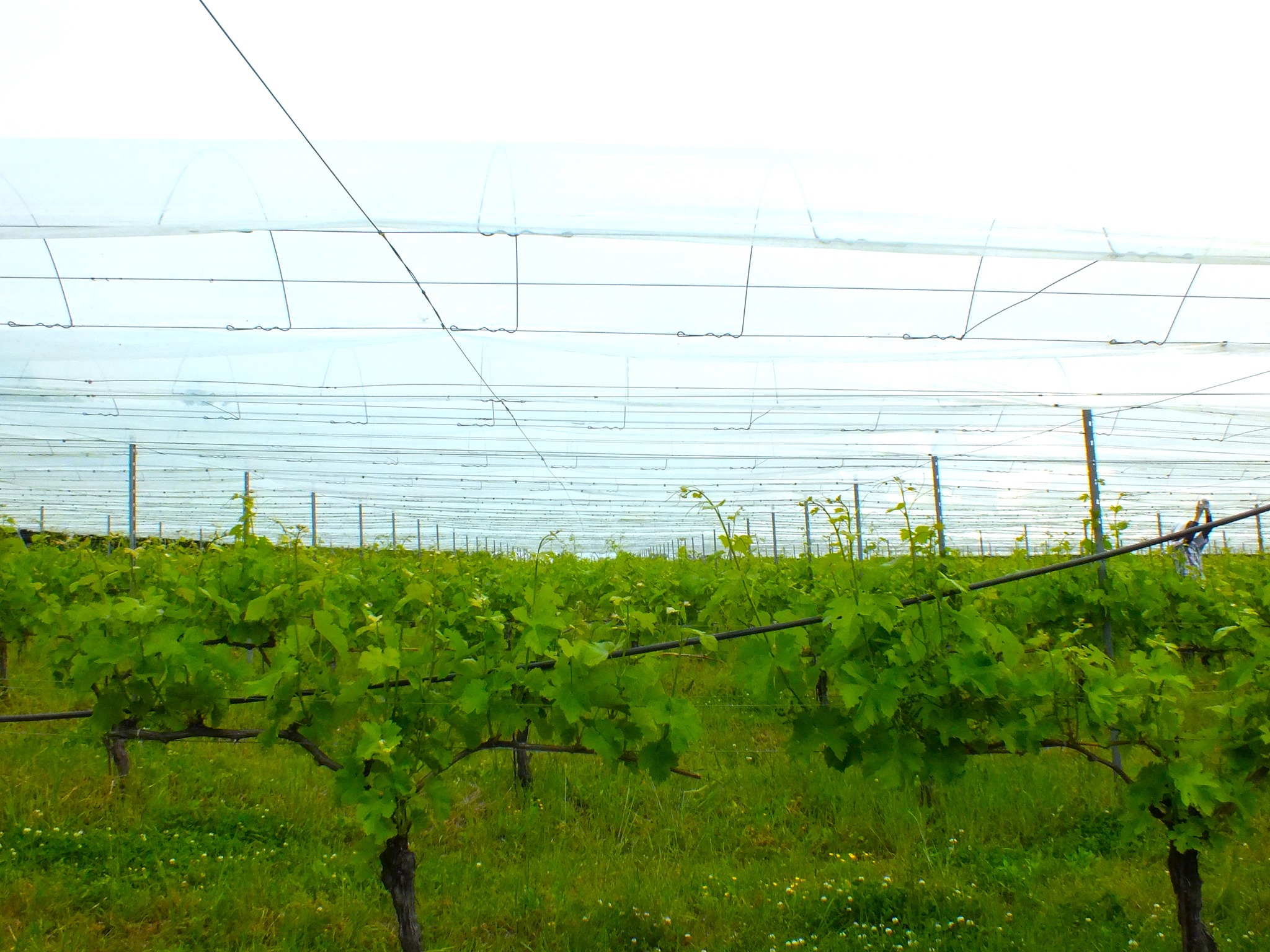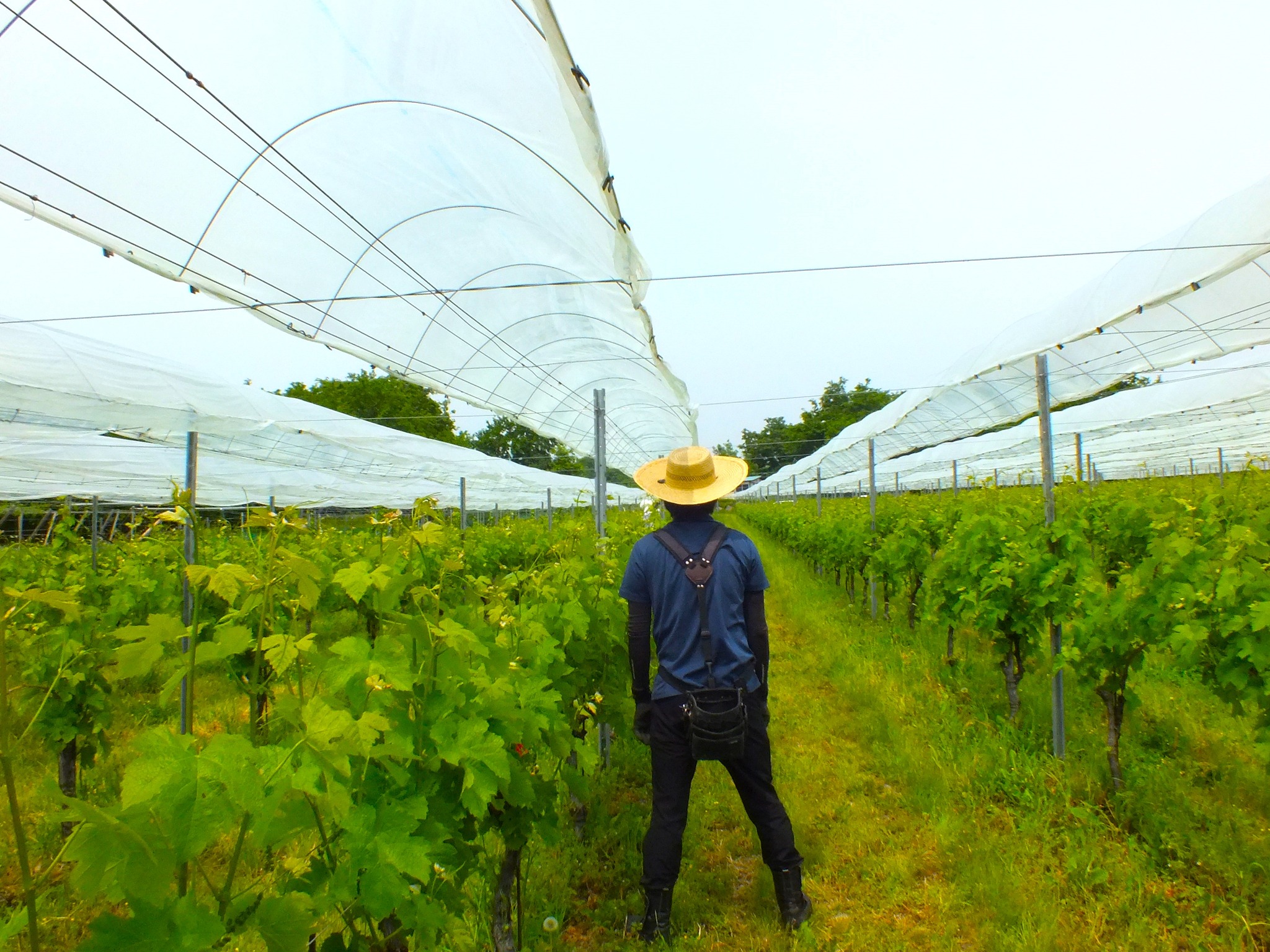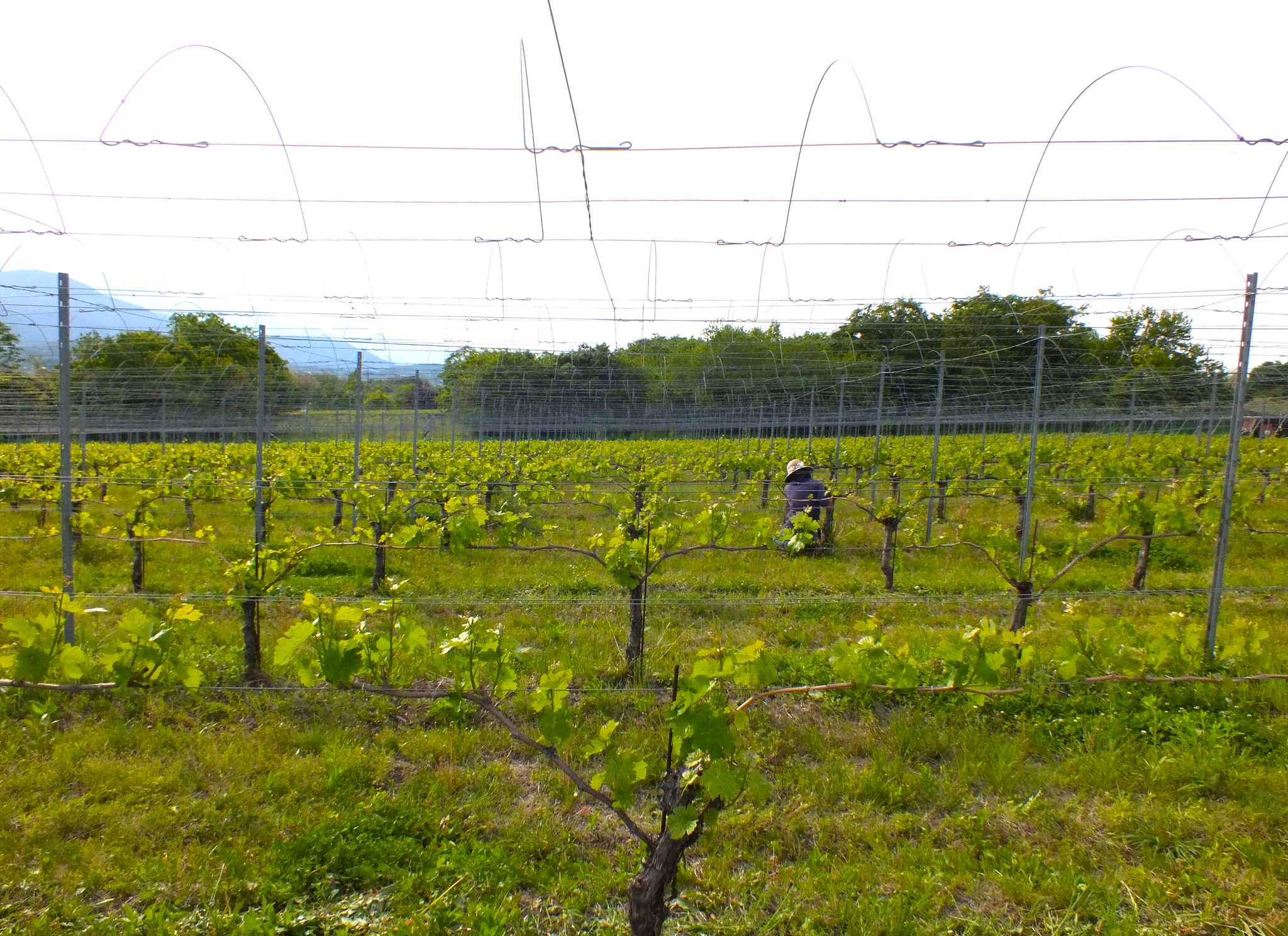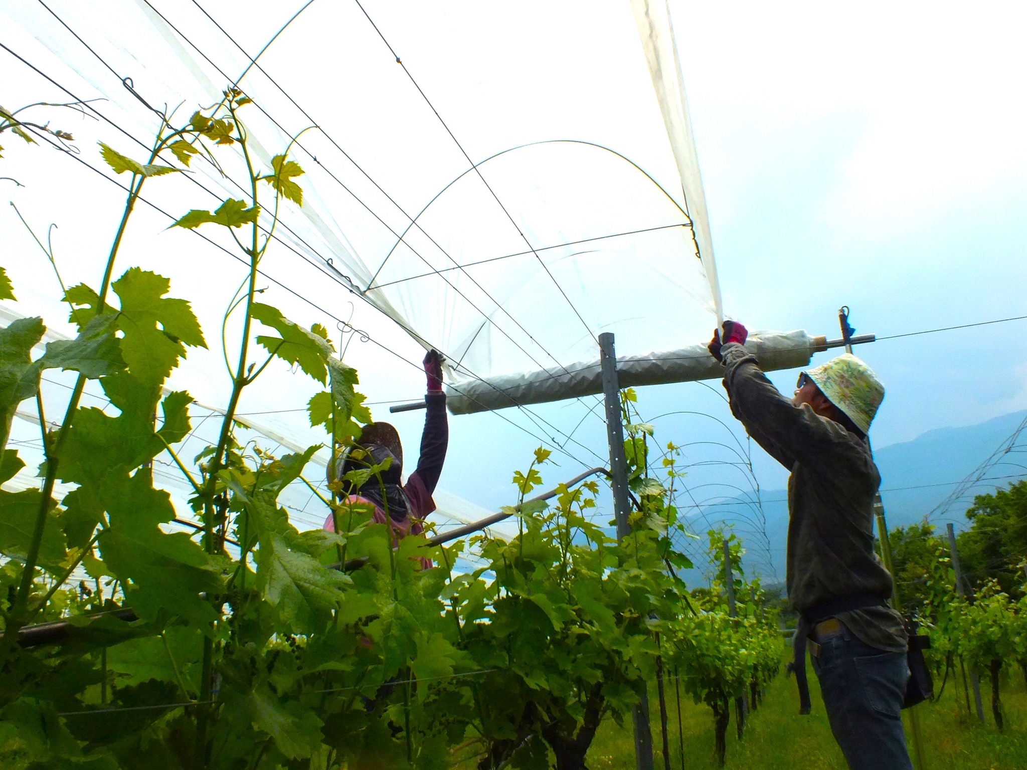 韮崎圃場のメルローの芽かきとトンネルビニールがけを行いました。