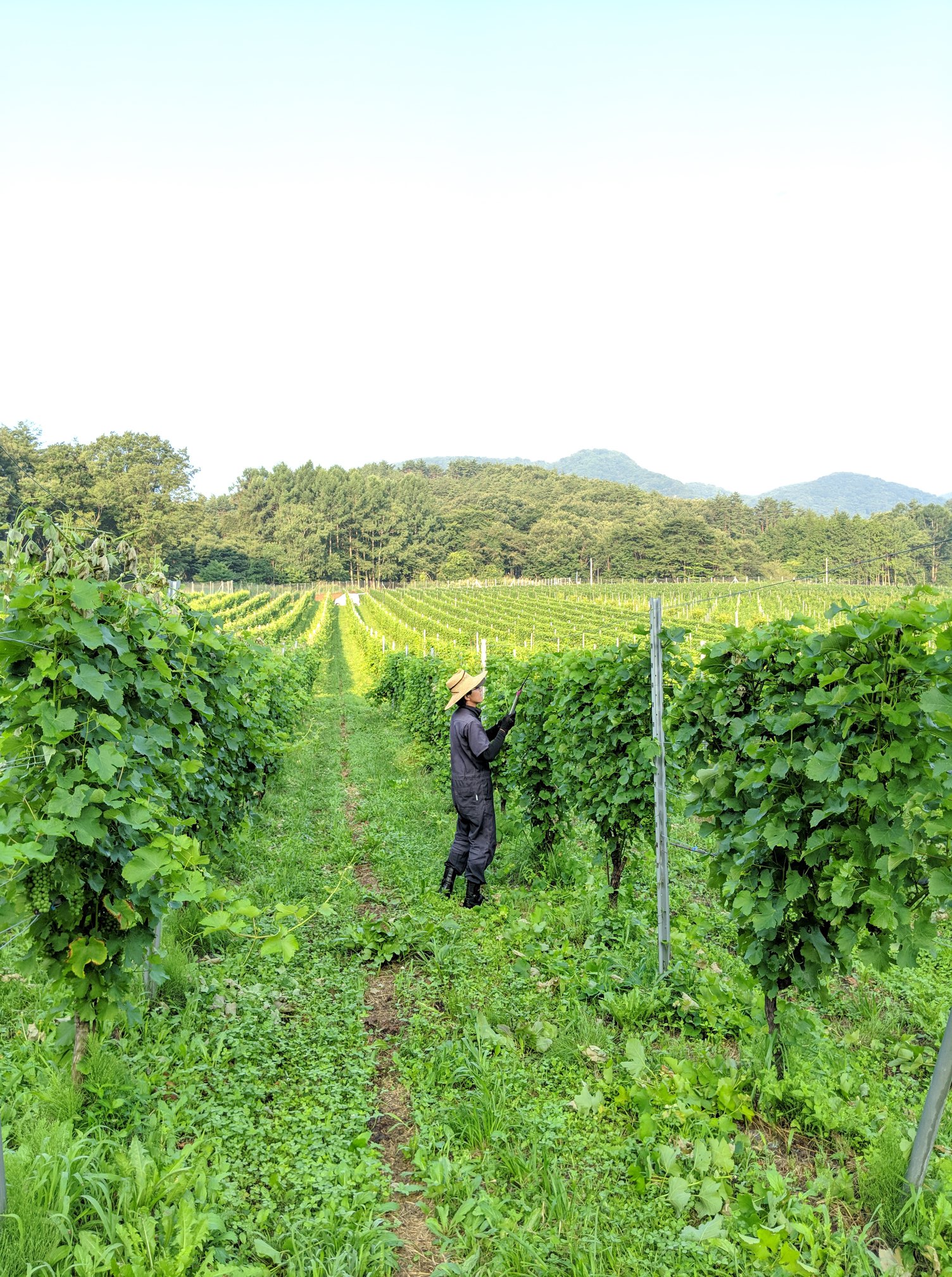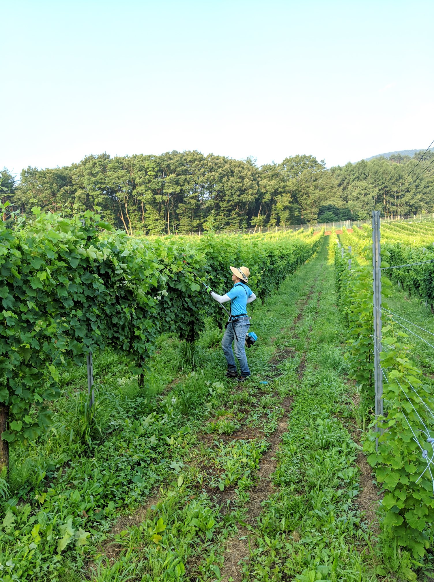 白州Vineyardのソーヴィニヨン・ブランの摘芯と新梢誘引を行いました。