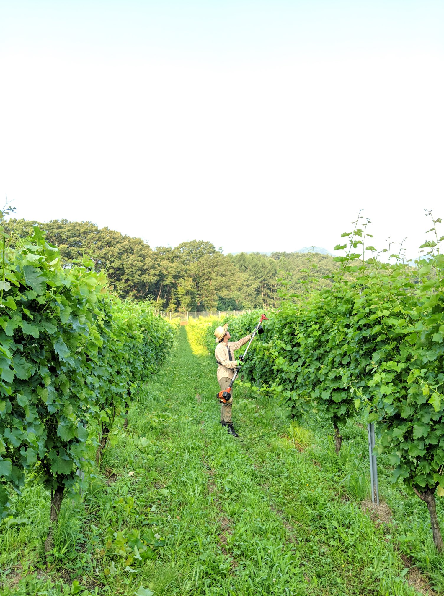 刈払い機の先端にバリカンアタッチメントを取付け、誘引線や柱に気を付けながら伸びすぎた新梢を慎重にカットしていきます。ぶどうの実に養分を行き渡らせる重要な作業です。その後、手作業で刈り残しの副梢などもカットします。近い将来トラクター摘芯機も導入予定ですが、全ての作業において、いかに手作業で正確にかつ、手早く摘芯ができるようになるかは追求していくべき我々の永遠の課題だと思っています。