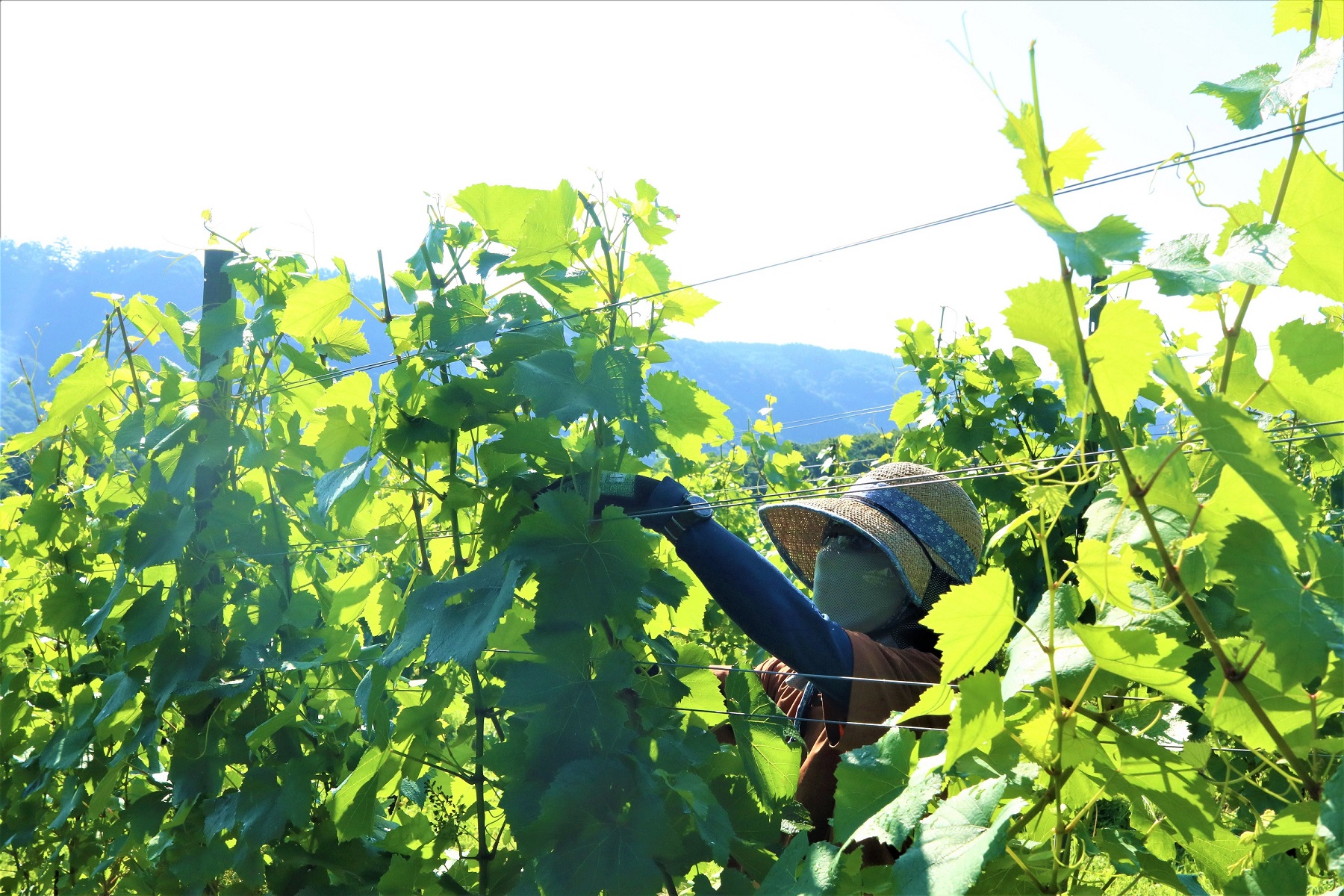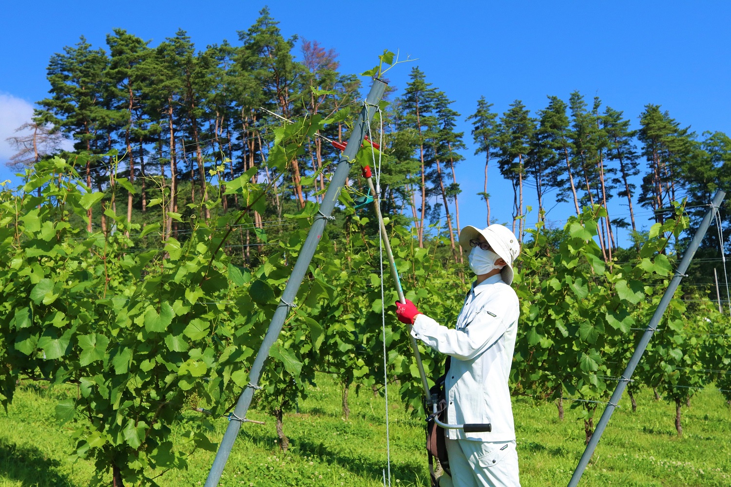 6月14日に関東甲信地方の梅雨入りが発表され、これから雨の時期が多くなるため、病気の発生を極力抑えるためにも、新梢の先端の摘芯を行って、混雑の原因となる副梢をカットしたり、飛び出している新梢を架線に入れて、きれいに整理して、風通しを良くしています。